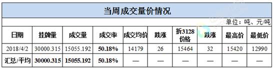 累計(jì)情況:截至4月2日,累計(jì)計(jì)劃出庫(kù)48.01萬(wàn)噸,累計(jì)出庫(kù)成交29.48萬(wàn)噸,成交率為61.41%;成交最高價(jià)16310元/噸,最低價(jià)12850元/噸。