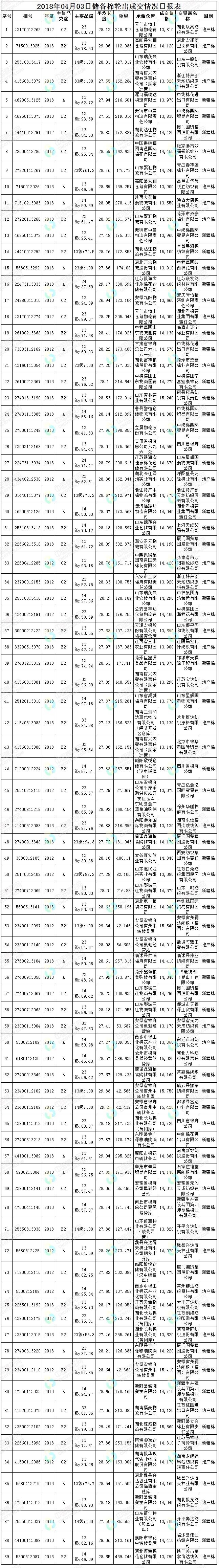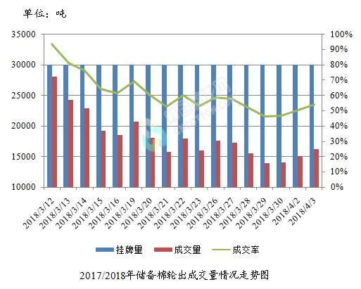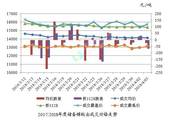 4月3日儲(chǔ)備棉輪出銷售資源30000.473噸,實(shí)際成交16246.717噸,成交率54.15%。平均成交價(jià)格14155元/噸(較前一日下跌24元/噸);折3128價(jià)格15398元/噸(較前一日下跌66元/噸)。