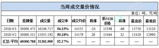 累計(jì)情況:截至4月3日,累計(jì)計(jì)劃出庫(kù)51.01萬(wàn)噸,累計(jì)出庫(kù)成交31.11萬(wàn)噸,成交率為60.98%;成交最高價(jià)16310元/噸,最低價(jià)12850元/噸。