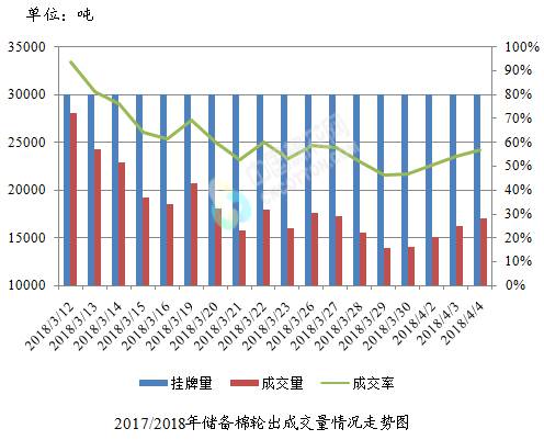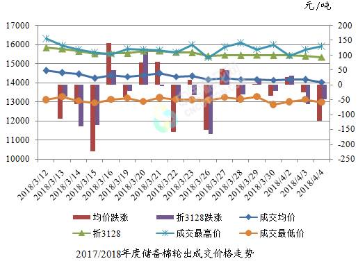 4月4日儲(chǔ)備棉輪出銷售資源30002.18噸,實(shí)際成交16997.928噸,成交率56.66%。平均成交價(jià)格14035元/噸(較前一日下跌120元/噸);折3128價(jià)格15349元/噸(較前一日下跌49元/噸)。