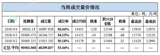 累計(jì)情況:截至4月4日,累計(jì)計(jì)劃出庫(kù)54.01萬(wàn)噸,累計(jì)出庫(kù)成交32.81萬(wàn)噸,成交率為60.74%;成交最高價(jià)16310元/噸,最低價(jià)12850元/噸。