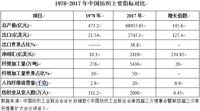 1978年-2017年中國(guó)紡織工業(yè)總產(chǎn)值從473.2億元猛增到68935.65億元,增長(zhǎng)145.6倍;出口從21.54億美元增到2745.1億美元,增長(zhǎng)127.4倍,紡織品出口占世界紡織貿(mào)易的36.8%;凈創(chuàng)匯從10.3億美元增長(zhǎng)到2419億美元。(編輯:DYL)