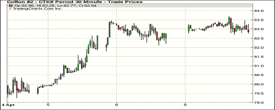 9日紐約期棉全面收漲。1805合約結(jié)算價82.91美分,漲37點;1807合約結(jié)算價82.76美分,漲58點;1812合約結(jié)算價78.17美分,漲23點;1903合約結(jié)算價78.27美分,漲15點。其他合約上漲4-17點不等。當日5月合約小幅高開,開盤后交易重心受支撐上行,至當日最高點83.69美分處賣盤入場,市場承壓走低,后幾次試圖穩(wěn)定在83美分之上,因上漲動力不足未果,最終小幅收漲。美國農(nóng)業(yè)部4月全球供需預(yù)測將于北京時間11日凌晨發(fā)布,市場普遍關(guān)注中國對美棉加征25%的關(guān)稅對策將對棉花市場產(chǎn)生何種影響。外圍美元指數(shù)下跌,玉米、大豆和小麥期貨上漲。