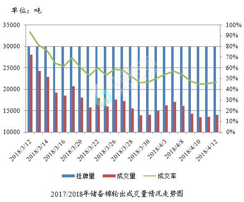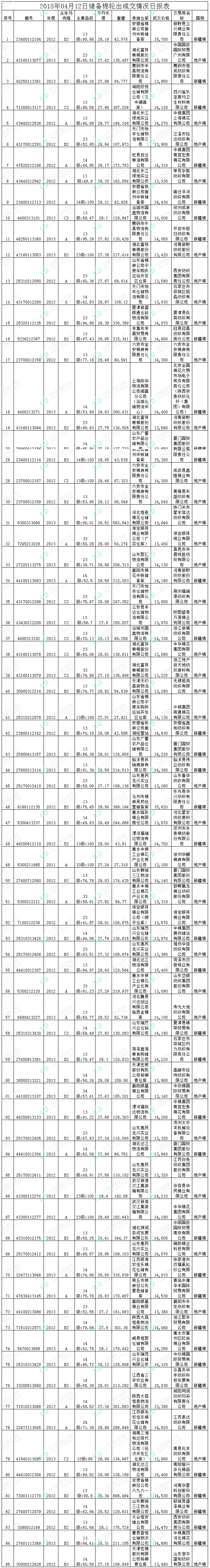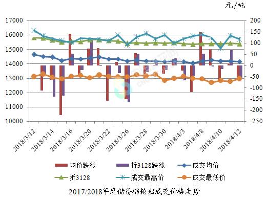 4月12日儲備棉輪出銷售資源30004.285噸,實際成交14014.915噸,成交率46.71%。平均成交價格14143元/噸(較前一日下跌51元/噸);折3128價格15383元/噸(較前一日下跌63元/噸)。