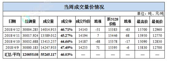 累計情況:截至4月12日,累計計劃出庫69萬噸,累計出庫成交39.9萬噸,成交率為58%;成交最高價16310元/噸,最低價12700元/噸。