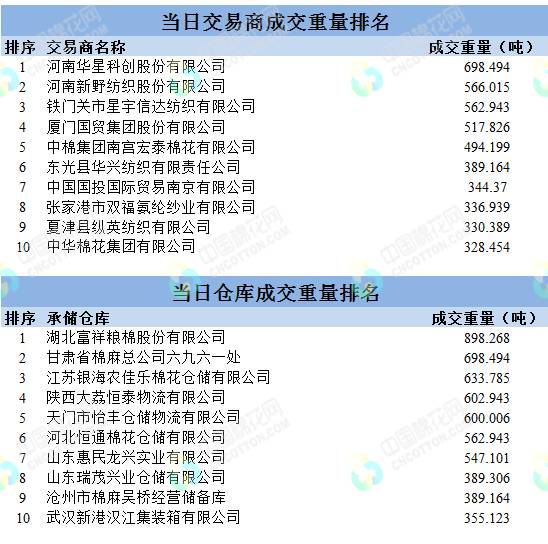 地產(chǎn)棉成交6824.018噸,成交率29.9%,成交均價13710元/噸,平均加價154元/噸,最高成交價14920元/噸,最低成交價12960元/噸;新疆棉成交7190.897噸,成交率100%,成交均價14554元/噸,平均加價813元/噸,最高成交價15700元/噸,最低成交價13650元/噸。