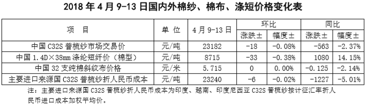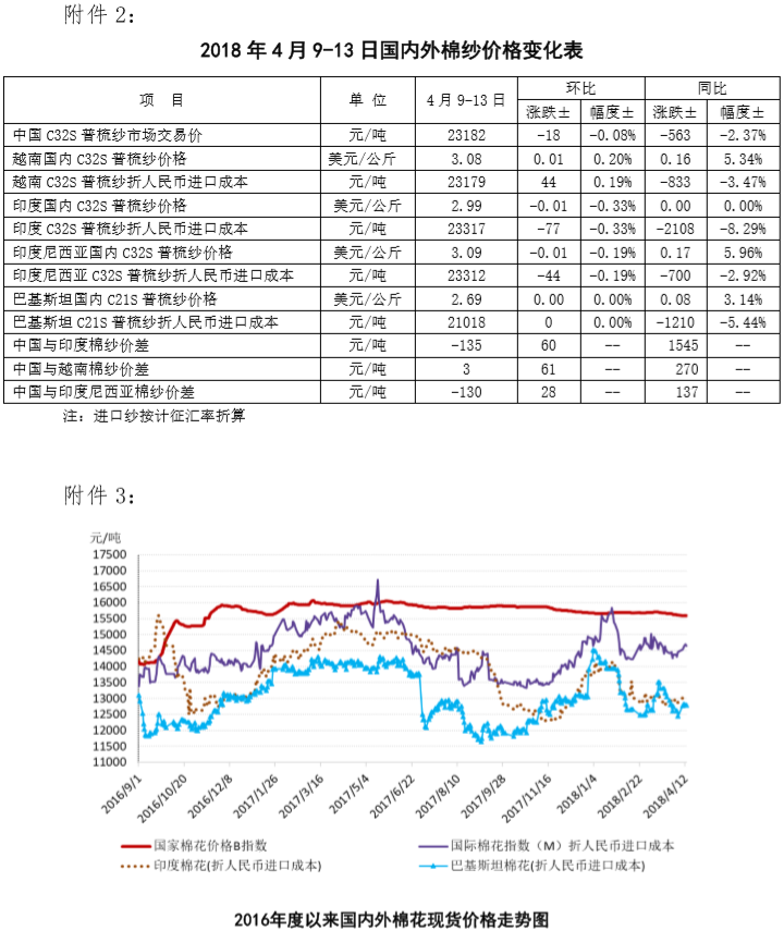 附件2:2018年4月9-13日國(guó)內(nèi)外棉紗價(jià)格變化表
