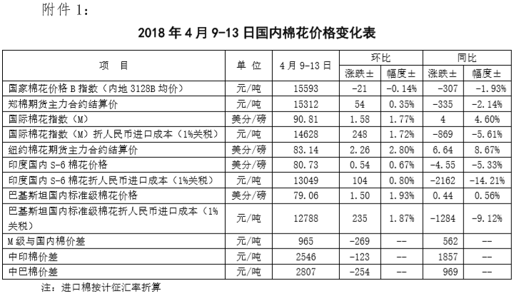 附件1:2018年4月9-13日國(guó)內(nèi)外棉花價(jià)格變化表