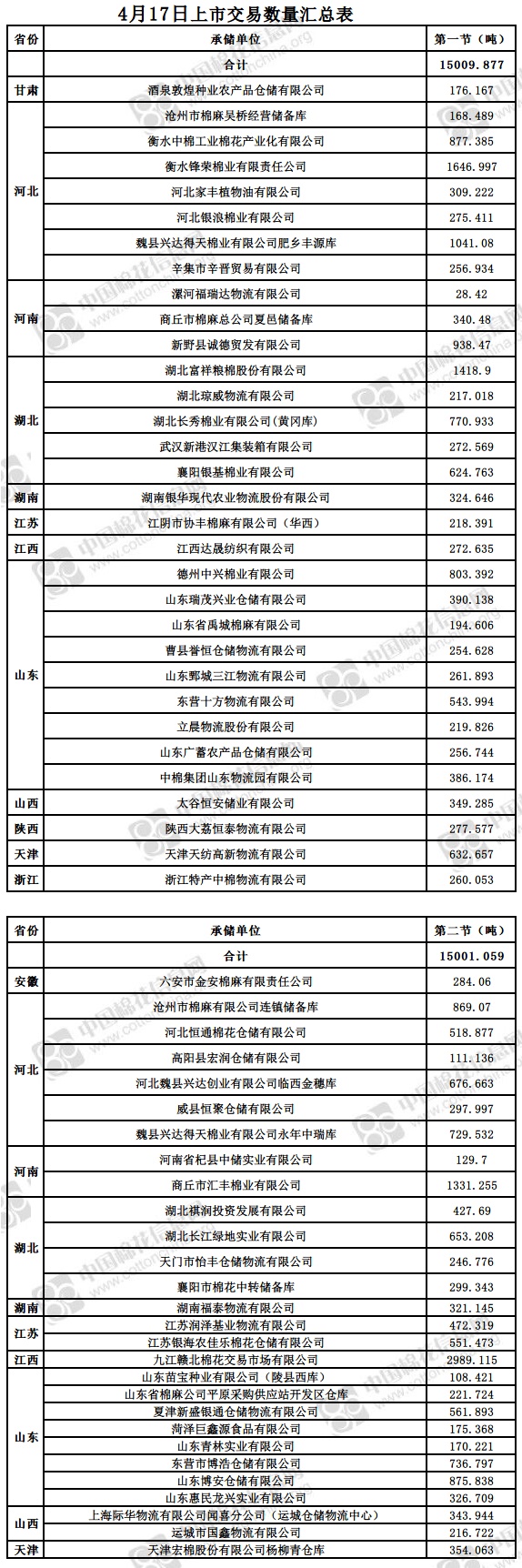 4月17日兩節(jié)共計輪出儲備棉30010.936噸。第一節(jié)銷售儲備棉15009.877噸,其中需要倒垛出庫77捆。第二節(jié)銷售儲備棉15001.059噸,其中需要倒垛出庫82捆。