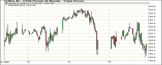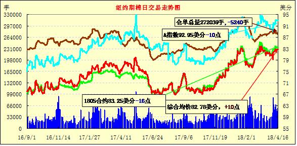 16日紐約期棉市場(chǎng)整體收跌。1805合約結(jié)算價(jià)83.25美分,跌16點(diǎn);1807合約結(jié)算價(jià)83.22美分,跌13點(diǎn);1812合約結(jié)算價(jià)78.54美分,跌37點(diǎn);1903合約結(jié)算價(jià)79.67美分,跌36點(diǎn)。7月合約小幅高開(kāi),開(kāi)盤(pán)后缺乏有利支撐市場(chǎng)下行,在83.10-83.60美分區(qū)間震蕩運(yùn)行,后受獲利了結(jié)盤(pán)壓力市場(chǎng)走低,跌至當(dāng)日低點(diǎn)83.04美分處買盤(pán)發(fā)力,交易重心走高,至高點(diǎn)處賣盤(pán)入場(chǎng)市場(chǎng)走低,后呈震蕩下跌趨勢(shì)運(yùn)行,臨近收盤(pán)時(shí)雖有小幅回升,但最終小幅收跌。近期現(xiàn)貨銷售由于價(jià)格原因有所減少。外圍美元指數(shù)下跌,玉米、大豆和小麥期貨下跌。