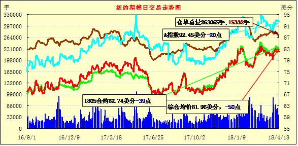 18日紐約期棉市場近跌遠(yuǎn)漲。1805合約結(jié)算價(jià)82.74美分,跌39點(diǎn);1807合約結(jié)算價(jià)82.61美分,跌34點(diǎn);1812合約結(jié)算價(jià)78.32美分,跌8點(diǎn);1903合約結(jié)算價(jià)78.42美分,跌4點(diǎn)。當(dāng)日7月合約小幅高開,開盤后圍繞83美分一線震蕩運(yùn)行,因缺乏有利支撐市場下行,低點(diǎn)處買盤發(fā)力,交易重心調(diào)頭向上,至當(dāng)日高點(diǎn)83.17美分處賣盤入場,市場承壓走低,后試圖穩(wěn)定在82.8美分之上,因上漲動(dòng)力不足未果,最終小幅收跌。1807合約連續(xù)三個(gè)交易日以跌勢收盤,累計(jì)跌幅74點(diǎn)。美國農(nóng)業(yè)部(USDA)美棉出口周報(bào)即將發(fā)布,市場普遍關(guān)注。在當(dāng)下春播期間,西德州干旱問題引發(fā)持續(xù)關(guān)注,預(yù)報(bào)本周晚些時(shí)間即將出現(xiàn)降雨天氣,棉農(nóng)翹首以待。詳情請關(guān)注本網(wǎng)即將發(fā)布的旱情監(jiān)測周度&季度報(bào)告。外圍美元指數(shù)上漲,玉米和小麥期貨上漲,大豆期貨下跌。