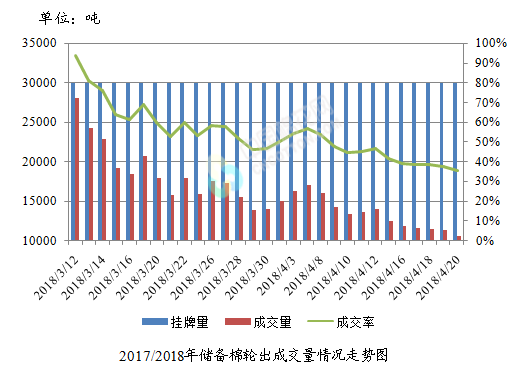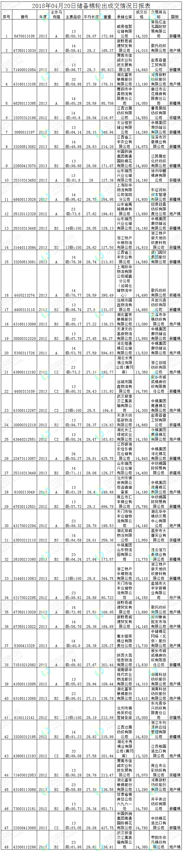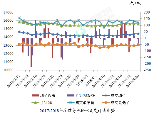 4月20日儲備棉輪出銷售資源30011.017噸,實際成交10595.221噸,成交率35.30%。平均成交價格14384元/噸(較前一日下降9元/噸);折3128價格15582元/噸(較前一日下降39元/噸)。