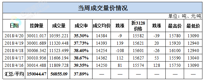 累計情況:截至4月20日,累計計劃出庫87萬噸,累計出庫成交46.8萬噸,成交率為54%;成交最高價16310元/噸,最低價12700元/噸。