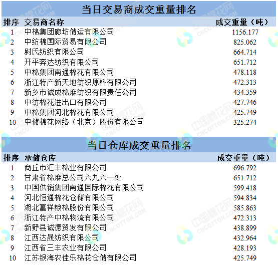 地產(chǎn)棉成交3527.701噸,成交率15%,成交均價13738元/噸,平均加價119元/噸,最高成交價14360元/噸,最低成交價13090元/噸;新疆棉成交7067.52噸,成交率100%,成交均價14706元/噸,平均加價766元/噸,最高成交價15780元/噸,最低成交價13770元/噸。