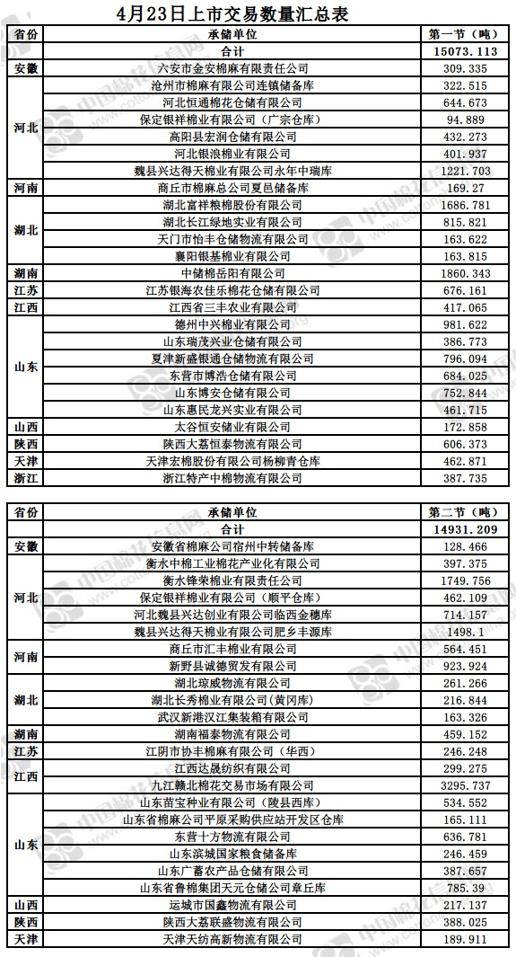 4月23日兩節(jié)共計(jì)輪出儲(chǔ)備棉30004.322噸。第一節(jié)銷售儲(chǔ)備棉15073.113噸,其中需要倒垛出庫(kù)85捆。第二節(jié)銷售儲(chǔ)備棉14931.209噸,其中需要倒垛出庫(kù)83捆。