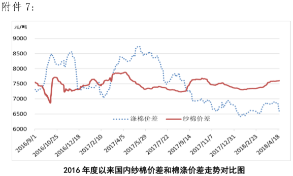 附件7:2016年度以來國內(nèi)紗棉價差和滌棉價差走勢對比圖