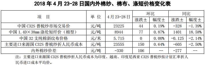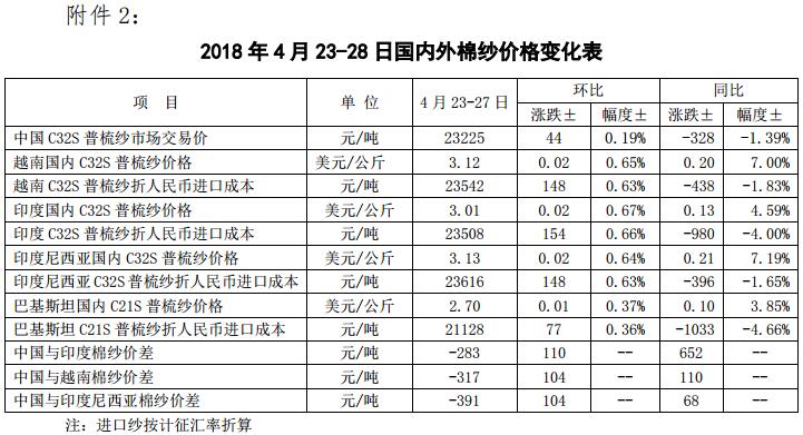 附件2:2018年4月23-28日國內(nèi)外棉紗價格變化表