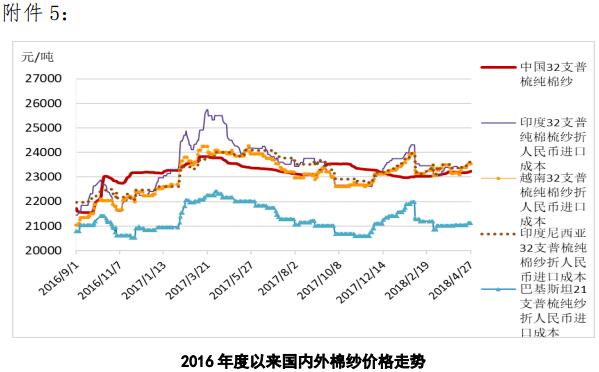 附件5:2016年度以來國內(nèi)外棉紗價格走勢圖