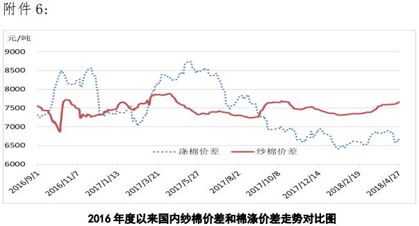 附件6:2016年度以來國內(nèi)紗棉價差和滌棉價差走勢對比圖