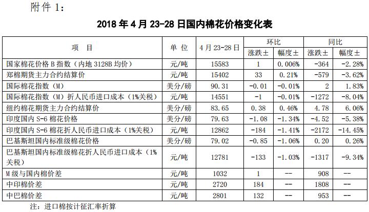 附件1:2018年4月23-28日國內(nèi)外棉花價格變化表