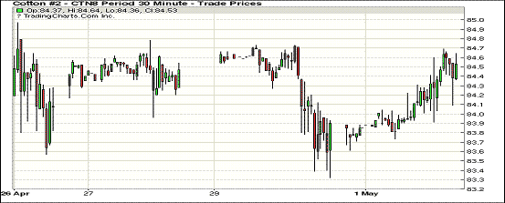 5月第一個(gè)交易日主力合約止跌反彈。1807合約結(jié)算價(jià)84.48美分,漲64點(diǎn);1812合約結(jié)算價(jià)78.80美分,漲2點(diǎn);1903合約結(jié)算價(jià)78.36美分,跌25點(diǎn)。當(dāng)日7月合約穩(wěn)定開(kāi)盤(pán),開(kāi)盤(pán)后因缺乏有利支撐交易重心走低,至當(dāng)日低點(diǎn)83.61美分處買盤(pán)發(fā)力,市場(chǎng)受支撐上行,盤(pán)中雖幾次承壓走低,但整體呈上升態(tài)勢(shì),臨近收盤(pán)處交易重心回落,最終未能站上84.5美分一線,但仍以小幅上漲收盤(pán)。西德州旱情引發(fā)市場(chǎng)持續(xù)關(guān)注。雖然近期該區(qū)域出現(xiàn)幾次短時(shí)降雨,但未能使旱情得到明顯緩解。詳情請(qǐng)關(guān)注本網(wǎng)稍后發(fā)布的美國(guó)主產(chǎn)棉區(qū)天氣狀況一覽。外圍美元指數(shù)上漲,玉米、大豆和小麥期貨上漲。