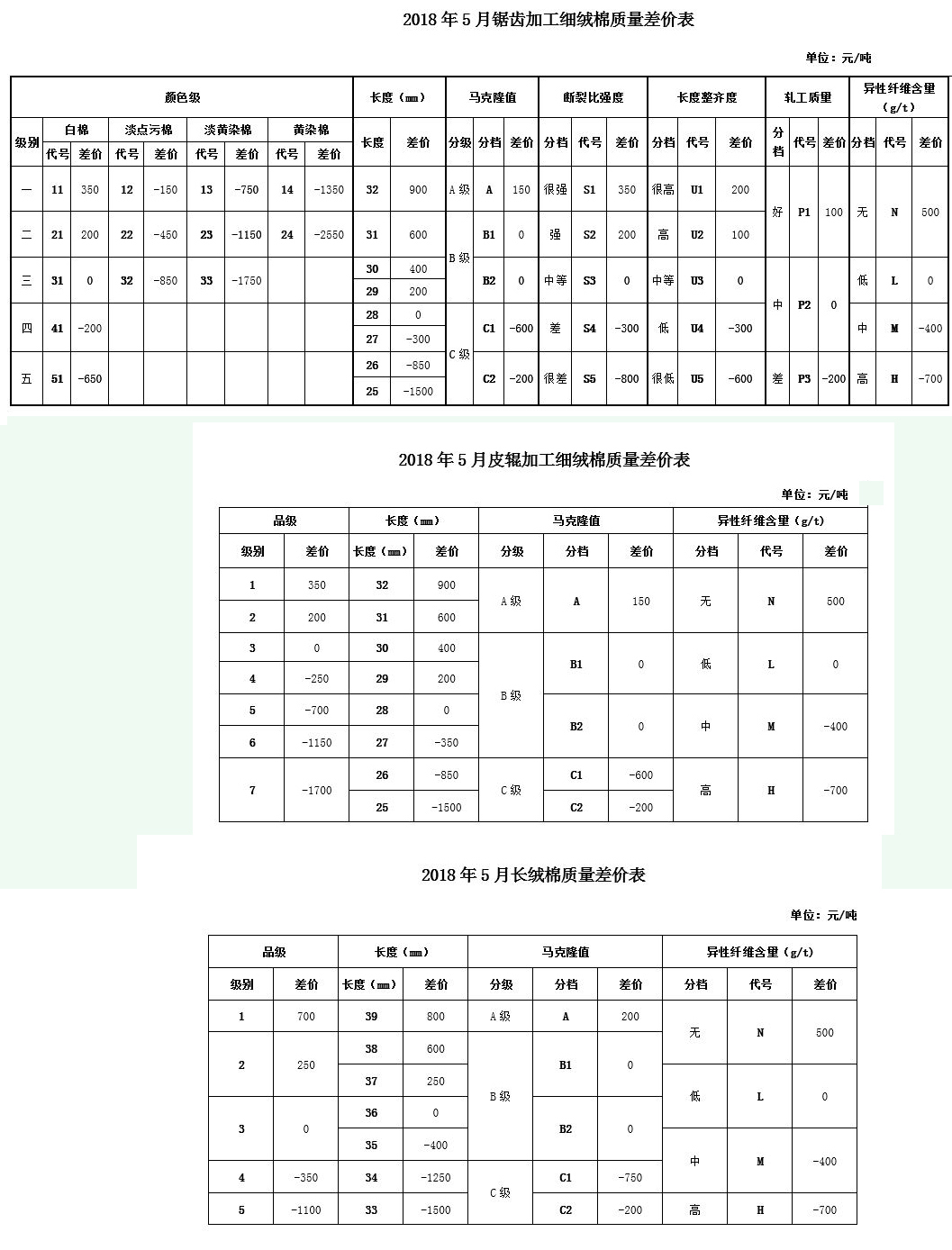 根據(jù)《中國棉花協(xié)會國產棉質量差價表管理辦法》規(guī)定,現(xiàn)正式發(fā)布2018年5月《鋸齒加工細絨棉質量差價表》、《皮輥加工細絨棉質量差價表》和《長絨棉質量差價表》(單位:元/噸)。
