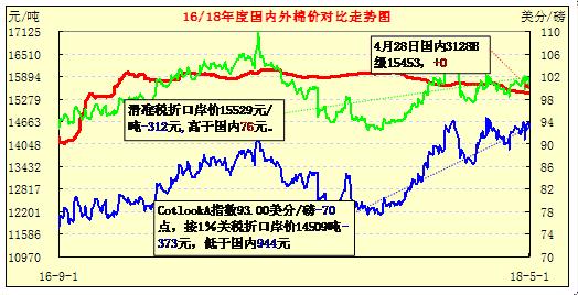 5月外棉折口岸價(jià)匯率6.2817,較上月6.3396升值0.9%,與此同時(shí),棉花增值稅率繼去年7月1日由13%下調(diào)至11%后,于今年5月1日再下調(diào)1個(gè)點(diǎn)至10%,在匯率升值和增值稅下調(diào)雙重作用下,外棉折口岸價(jià)進(jìn)一步下降,抵消國際棉價(jià)持續(xù)上揚(yáng)漲幅,內(nèi)外價(jià)差進(jìn)一步縮小。