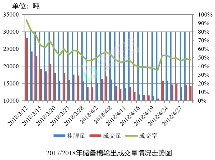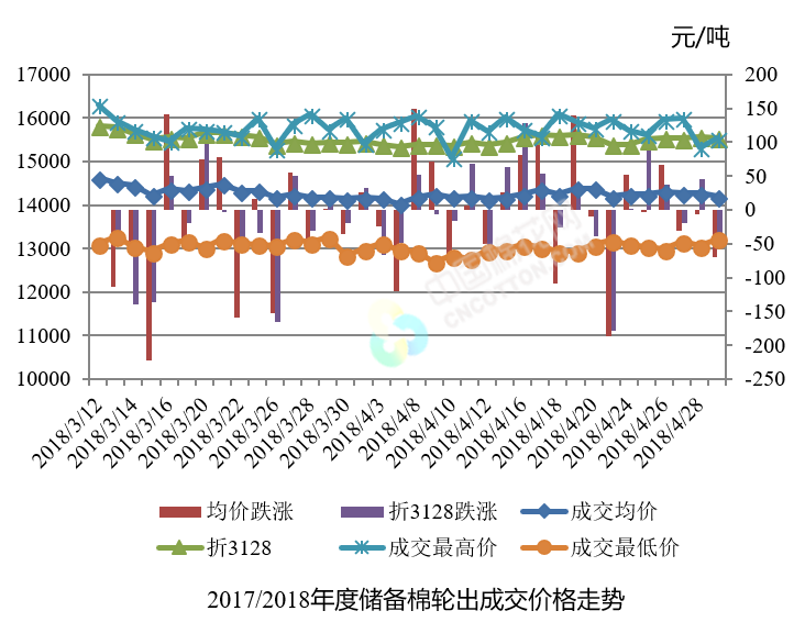 5月2日儲(chǔ)備棉輪出銷售資源30017.596噸,實(shí)際成交14285.002噸,成交率47.59%。平均成交價(jià)格14205元/噸(較前一日下跌70元/噸);折3128價(jià)格15546元/噸(較前一日下跌35元/噸)。