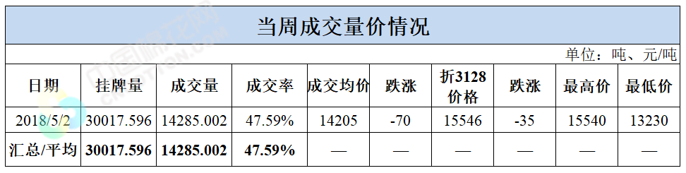 累計(jì)情況:截至5月2日,累計(jì)計(jì)劃出庫(kù)108萬(wàn)噸,累計(jì)出庫(kù)成交57.2萬(wàn)噸,成交率為53%;成交最高價(jià)16310元/噸,最低價(jià)12700元/噸。