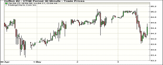 3日紐約期棉市場近跌遠(yuǎn)漲。1807合約結(jié)算價84.50美分,跌18點;1812合約結(jié)算價79.59美分,漲16點;1903合約結(jié)算價79.09美分,漲13點。當(dāng)日7月合約穩(wěn)定開盤,開盤后受買盤支撐交易重心上行突破85美分一線,后圍繞85美分窄幅波動,美棉出口周報發(fā)布后,由于本年度陸地棉簽約量處于市場預(yù)期低位,市場小幅走低,但在買盤有力支撐下迅速回彈,至當(dāng)日高點85.12美分處賣盤入場,交易重心承壓走低,下行擊穿84美分,因上漲動力不足,最終小幅收跌。據(jù)美國農(nóng)業(yè)部(USDA),4.19-4.26日一周美國凈簽約出口2017/18年度陸地棉43046噸(含新簽約54613噸,另取消11567噸前期訂單),較前一周減少39%,較近4周平均簽約量減少34%;裝運2017/18年度陸地棉98112噸,較前一周增加3%,較近4周平均持平。外圍美元指數(shù)下跌,大豆期貨下跌,玉米和小麥期貨上漲。