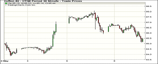 8日紐約期棉市場(chǎng)整體收跌。1807合約結(jié)算價(jià)85.38美分,跌61點(diǎn);1812合約結(jié)算價(jià)80.10美分,跌23點(diǎn);1903合約結(jié)算價(jià)79.83美分,跌24點(diǎn)。當(dāng)日7月合約小幅高開,開盤后因缺乏有利支撐交易重心下行,跌至86美分一線買盤低點(diǎn)發(fā)力,市場(chǎng)受支撐歐高,至當(dāng)日高點(diǎn)86.87美分處受獲利了結(jié)盤打壓市場(chǎng)下行,后幾次試圖穩(wěn)定在85.5美分一線未果,因上漲動(dòng)力不足,以跌勢(shì)收盤。美國(guó)農(nóng)業(yè)部(USDA)5月月報(bào)發(fā)布在即,市場(chǎng)密切關(guān)注其調(diào)整動(dòng)向。外圍美元指數(shù)上漲,大豆、玉米和小麥期貨上漲。