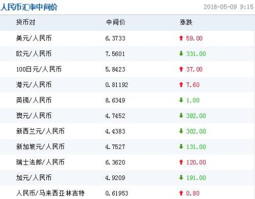 中國人民銀行授權(quán)中國外匯交易中心公布,2018年5月9日銀行間外匯市場人民幣匯率中間價為:1美元對人民幣6.3733元,1歐元對人民幣7.5601元,100日元對人民幣5.8423元,1港元對人民幣0.81192元,1英鎊對人民幣8.6349元,1澳大利亞元對人民幣4.7452元,1新西蘭元對人民幣4.4383元,1新加坡元對人民幣4.7527元,1瑞士法郎對人民幣6.3620元,1加拿大元對人民幣4.9209元,人民幣1元對0.61953馬來西亞林吉特,人民幣1元對9.9275俄羅斯盧布,人民幣1元對1.9750南非蘭特,人民幣1元對169.38韓元,人民幣1元對0.57649阿聯(lián)酋迪拉姆,人民幣1元對0.58861沙特里亞爾,人民幣1元對41.6564匈牙利福林,人民幣1元對0.56624波蘭茲羅提,人民幣1元對0.9853丹麥克朗,人民幣1元對1.3828瑞典克朗,人民幣1元對1.2762挪威克朗,人民幣1元對0.68190土耳其里拉,人民幣1元對3.0716墨西哥比索,人民幣1元對5.0171泰銖。