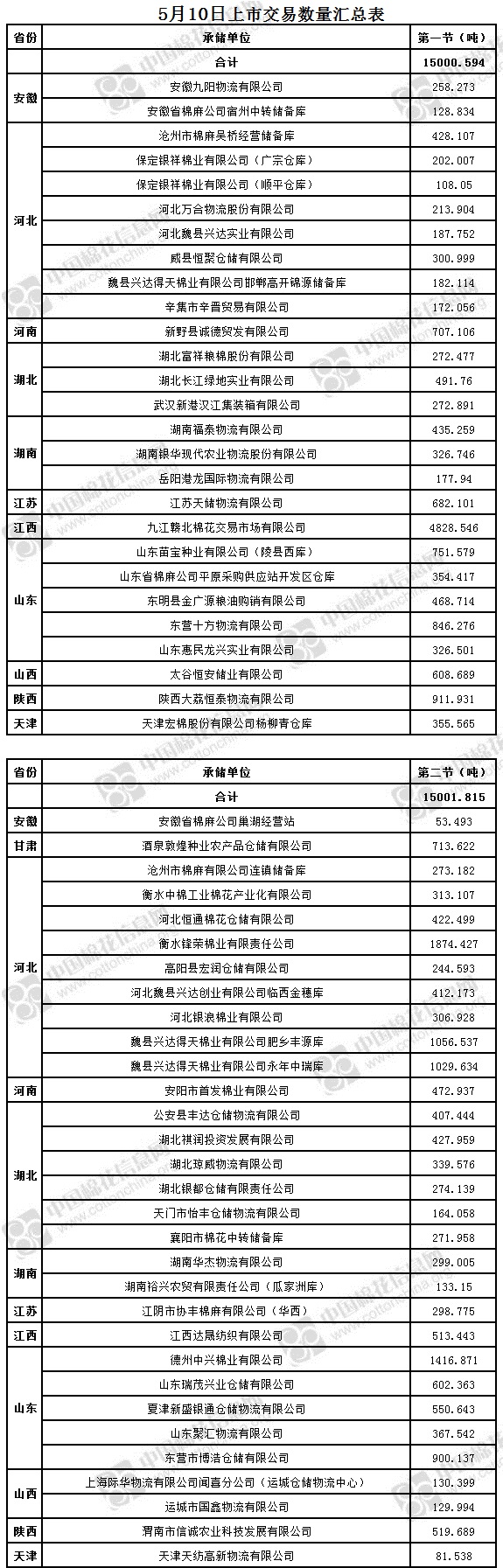 5月10日兩節(jié)共計(jì)輪出儲(chǔ)備棉30002.409噸。第一節(jié)銷(xiāo)售儲(chǔ)備棉15000.594噸,其中需要倒垛出庫(kù)104捆。第二節(jié)銷(xiāo)售儲(chǔ)備棉15001.815噸,其中需要倒垛出庫(kù)74捆。