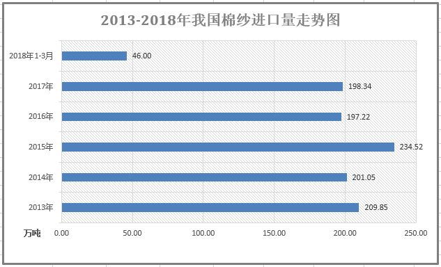 回顧近五年來我國棉紗進口量,在2015年達到234萬噸最高峰后,2016和2017年出現(xiàn)下跌,均低于200萬噸。2018年第一季度進口量46萬噸,同比下降達13.24%。這表明我國實行新的輪儲政策后,內(nèi)外棉價差出現(xiàn)回歸,有效的把一部分進口紗擋在國門外。