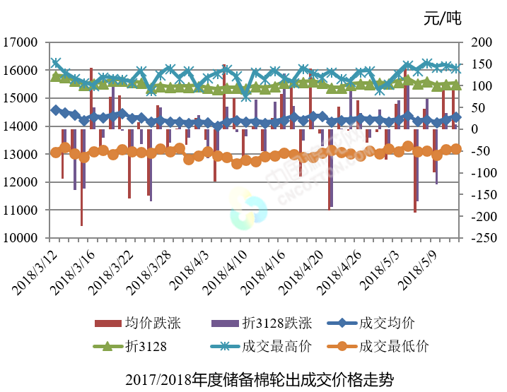 5月11日儲備棉輪出銷售資源30003.196噸,實際成交25162.484噸,成交率83.87%。平均成交價格14359元/噸(較前一日上漲93元/噸);折3128價格15543元/噸(較前一日上漲12元/噸)。