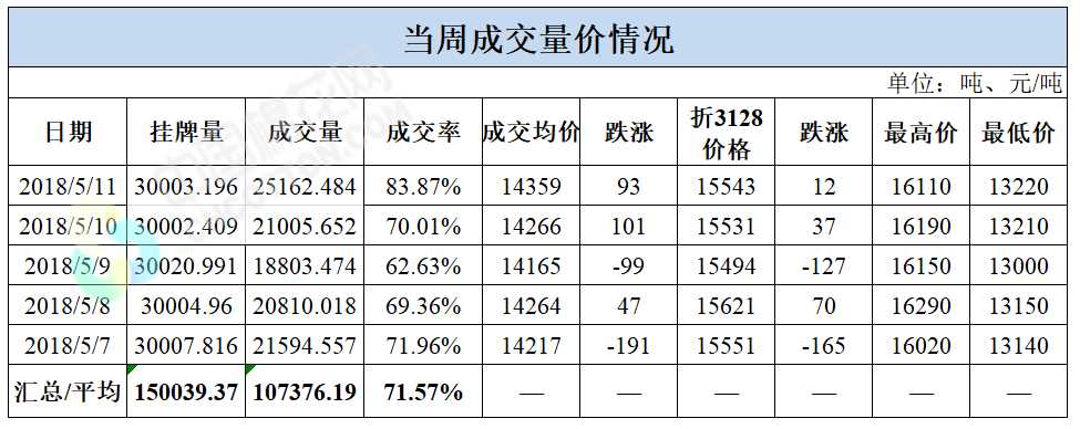 累計情況:截至5月11日,累計計劃出庫129萬噸,累計出庫成交70.7萬噸,成交率為55%;成交最高價16310元/噸,最低價12700元/噸。