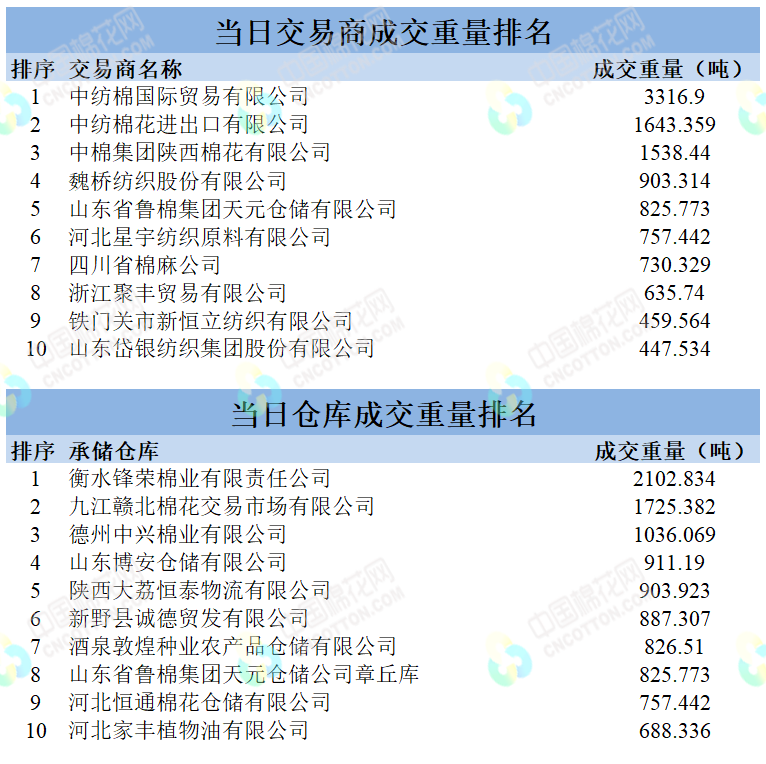 地產(chǎn)棉成交15816.806噸,成交率77%,成交均價14141元/噸,平均加價311元/噸,最高成交價15670元/噸,最低成交價13220元/噸;新疆棉成交9345.678噸,成交率100%,成交均價14728元/噸,平均加價1095元/噸,最高成交價16110元/噸,最低成交價14010元/噸。