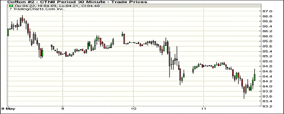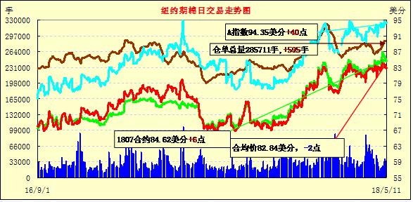 11日紐約期棉市場近漲遠跌。1807合約結(jié)算價84.62美分,漲6點;1812合約結(jié)算價80.24美分,漲13點;1903合約結(jié)算價80.06美分,漲18點。7月合約穩(wěn)定開盤,開盤后在84.50-85美分區(qū)間震蕩運行,后賣盤入場,市場承壓走低,至當日低點83.50美分處買盤發(fā)力,交易重心上行,最終小幅收漲。據(jù)CFTC,截至5月4日ICE期棉未點價合約量累計163680張,較前一周增加3612張。其中,1807合約55085張,減469張;1812合約38546張,增加1129張。大量未點價合約對期棉行情形成支撐。外圍美元指數(shù)下跌,大豆、小麥和玉米期貨下跌。