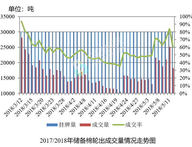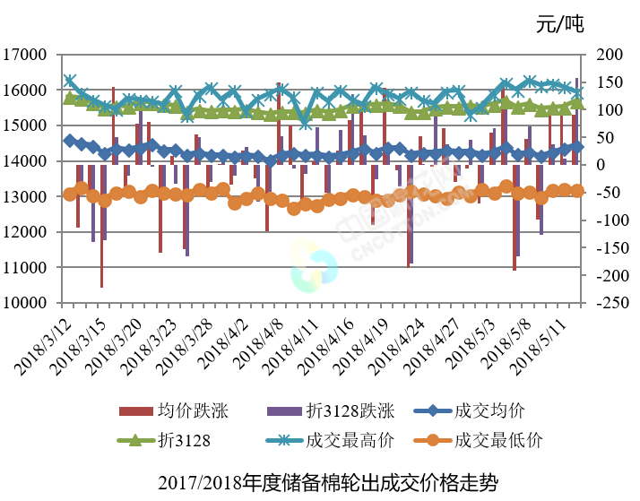 5月14日儲(chǔ)備棉輪出銷售資源30003.803噸,實(shí)際成交18223.989噸,成交率60.74%。平均成交價(jià)格14450元/噸(較前一日上漲91元/噸);折3128價(jià)格15701元/噸(較前一日上漲158元/噸)。