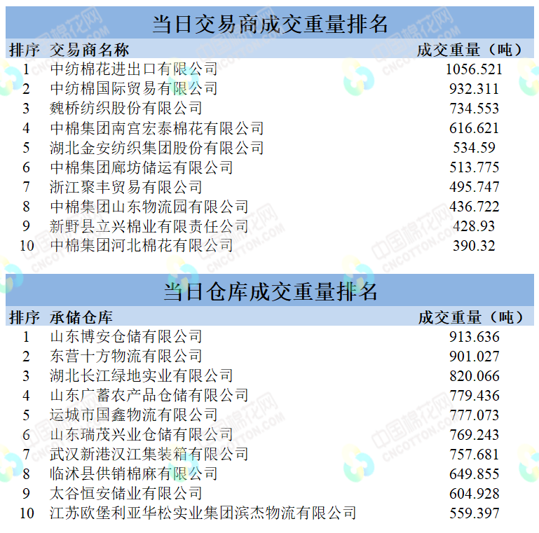 地產(chǎn)棉成交7903.332噸,成交率40%,成交均價(jià)13997元/噸,平均加價(jià)272元/噸,最高成交價(jià)15080元/噸,最低成交價(jià)13210元/噸;新疆棉成交10320.657噸,成交率100%,成交均價(jià)14796元/噸,平均加價(jià)1004元/噸,最高成交價(jià)15970元/噸,最低成交價(jià)14060元/噸。