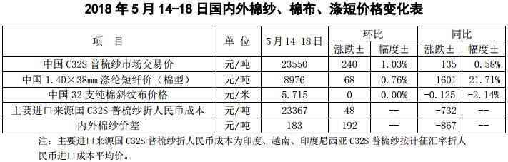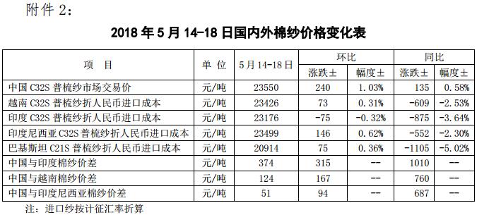 附件2:2018年5月14-18日國(guó)內(nèi)外棉紗價(jià)格變化表