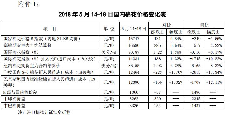 附件1:2018年5月14-18日國(guó)內(nèi)外棉花價(jià)格變化表