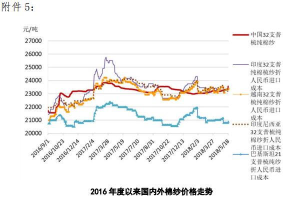 附件5:2016年度以來國(guó)內(nèi)外棉紗價(jià)格走勢(shì)圖