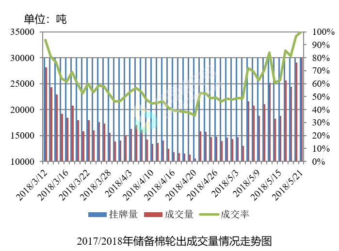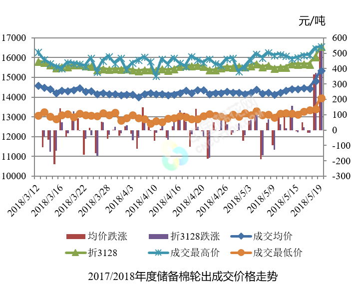5月21日儲(chǔ)備棉輪出銷(xiāo)售資源30002.917噸,實(shí)際成交30002.917噸,成交率100.00%。平均成交價(jià)格15385元/噸(較前一日上漲546元/噸);折3128價(jià)格16590元/噸(較前一日上漲532元/噸)。
