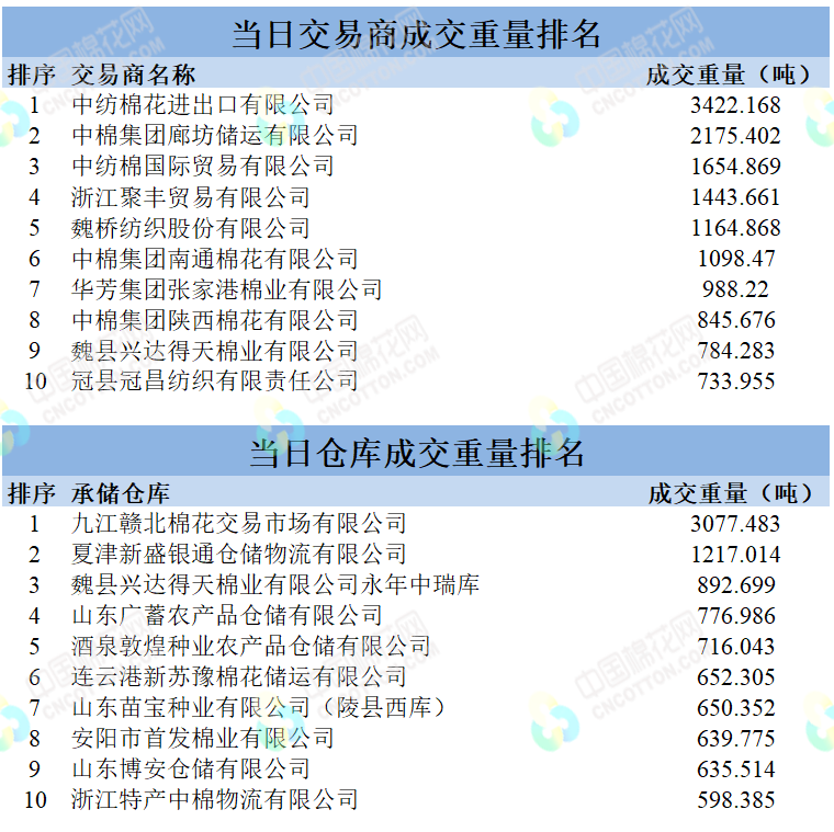 地產(chǎn)棉成交11979.662噸,成交率100%,成交均價(jià)14725元/噸,平均加價(jià)998元/噸,最高成交價(jià)16430元/噸,最低成交價(jià)14000元/噸;新疆棉成交18023.255噸,成交率100%,成交均價(jià)15824元/噸,平均加價(jià)2083元/噸,最高成交價(jià)16590元/噸,最低成交價(jià)15080元/噸。