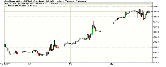 21日紐約期棉市場大幅收漲。1807合約結(jié)算價88.42美分,漲187點;1812合約結(jié)算價84.16美分,漲173點;1903合約結(jié)算價84.05美分,漲181點。其他合約上漲120-177點不等。當日7月合約高開高走,開盤后市場受投機買盤支撐走高,維持在88.20-88.80美分區(qū)間高位震蕩運行,后賣盤入場市場承壓走低跌破88美分,低點處買盤發(fā)力,交易重心上行,后雖再次出現(xiàn)短暫下行,但受利好拉動,最終大幅收漲。1807合約近五個交易日累計上漲472點。外圍美元指數(shù)上漲,玉米和大豆期貨上漲,小麥期貨下跌。
