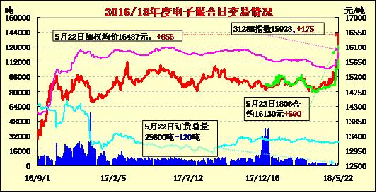 5月22日電子撮合交易成交量較前一交易日增加,合同均價多數(shù)收漲。其中MA1808成交量較大,為180噸;活躍交投的合同多集中于中遠期合同,MA1808訂貨量最大,累計訂貨量為7170噸。資金炒作中國天氣有望使棉價維持強勢,但從USDA數(shù)據(jù)來看,國際市場資源充足,7月合約結束后焦點有望轉向供需基本面,巨大的期末庫存將對期價構成壓力,因此對近期的強勢謹慎對待為宜。