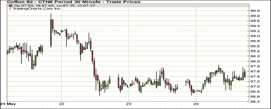 5月24日紐約期棉市場整體收漲。1807合約結(jié)算價87.46美分,漲50點;1812合約結(jié)算價85.55美分,漲150點;1903合約結(jié)算價85.14美分,漲151點。7月合約小幅高開,開盤后受買盤支撐交易重心走高,至當日高點87.85美分處賣盤入場,市場承壓走低,美棉出口周報發(fā)布后,單周簽約出口量創(chuàng)年度新低,跌幅加深,至當日低點86.64美分處買盤發(fā)力,交易中心受支撐上行,后維持震蕩態(tài)勢,最終以小幅上漲收盤。據(jù)美國農(nóng)業(yè)部(USDA),5.10-5.17日一周美國凈簽約出口2017/18年度陸地棉11499噸(含新簽約16760噸,另取消5261噸前期訂單),較前一周減少67%,較近4周平均簽約量減少76%;裝運2017/18年度陸地棉91399噸,較前一周減少5%,較近4周平均減少10%。西德州旱情持續(xù),周五至周末將出現(xiàn)36℃以上的高溫天氣,對期棉價格形成支撐。外圍美元指數(shù)下跌,玉米和大豆期貨下跌,小麥期貨上漲。下周一為美國陣亡將士紀念日,紐約期市休市一天。