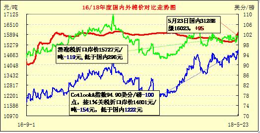 5月24日內(nèi)外棉價小步回調(diào)。受隔日鄭棉期貨整理和紐約期收跌影響,國內(nèi)現(xiàn)貨棉價止?jié)q回調(diào),328B指數(shù)微跌11元,報16012元/噸,Cotlook A指數(shù)94.45美分/磅,跌45點。滑準(zhǔn)稅折口岸價15682元,1%稅率折口岸價14732元/噸,分別較昨日跌45和69元,內(nèi)外棉價差分別擴大至330和1280元。
