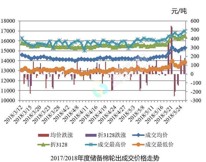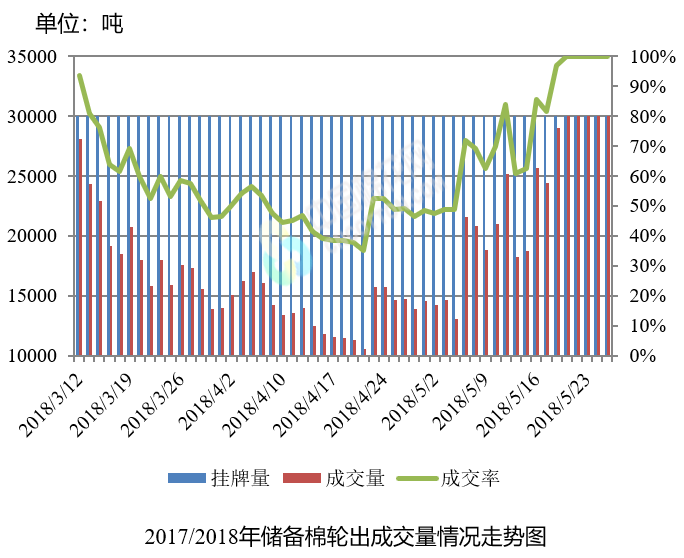5月25日儲備棉輪出銷售資源30007.709噸,實際成交30007.709噸,成交率100.00%。平均成交價格15342元/噸(較前一日上漲115元/噸);折3128價格16562元/噸(較前一日上漲181元/噸)。